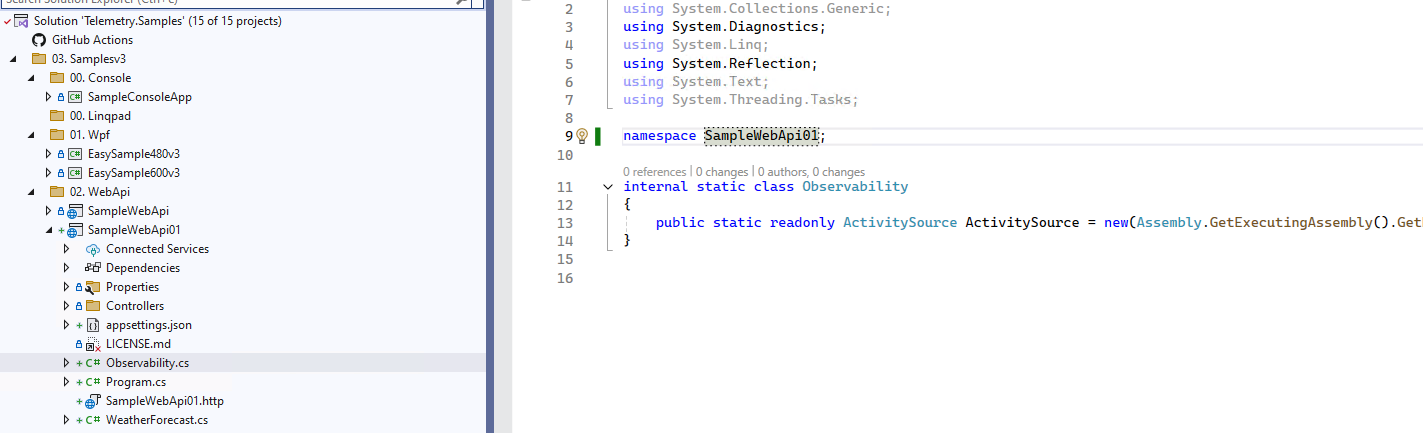 In our solution we’ll choose to use one ActivitySource class for every project, defined as below:
