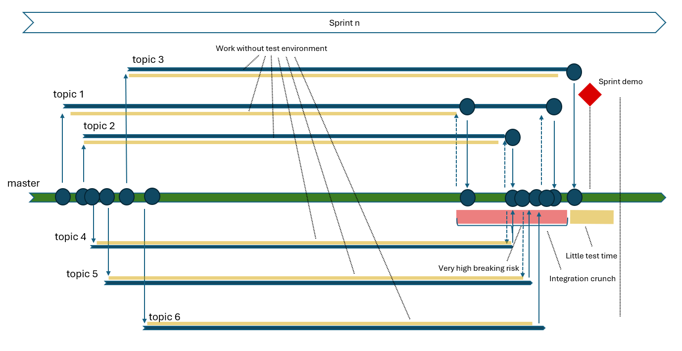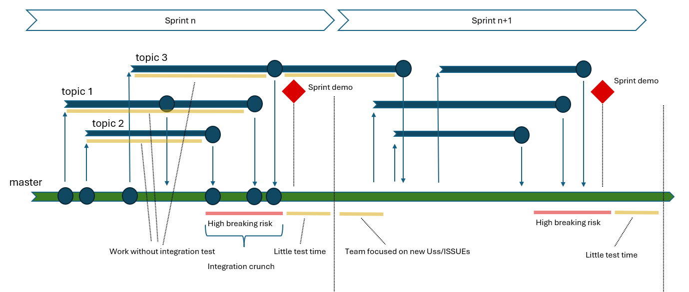 With such organization, developers often work alone, on their branches, for most of the sprint duration and all the topics are tested with very limited integration with each other.