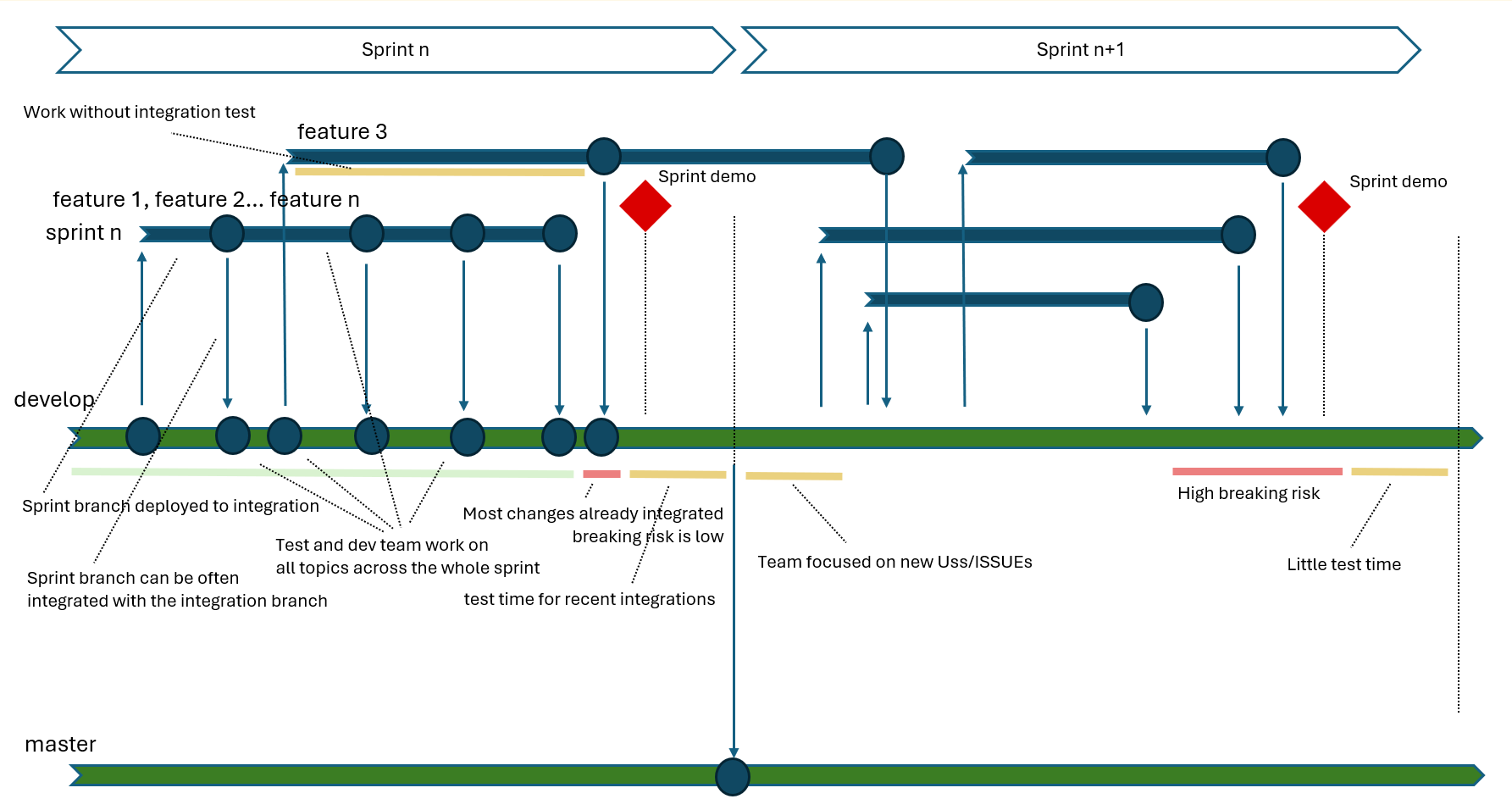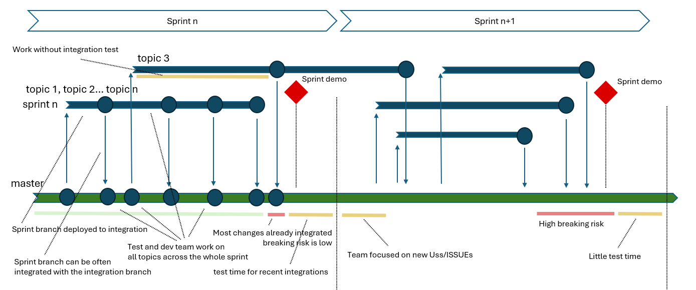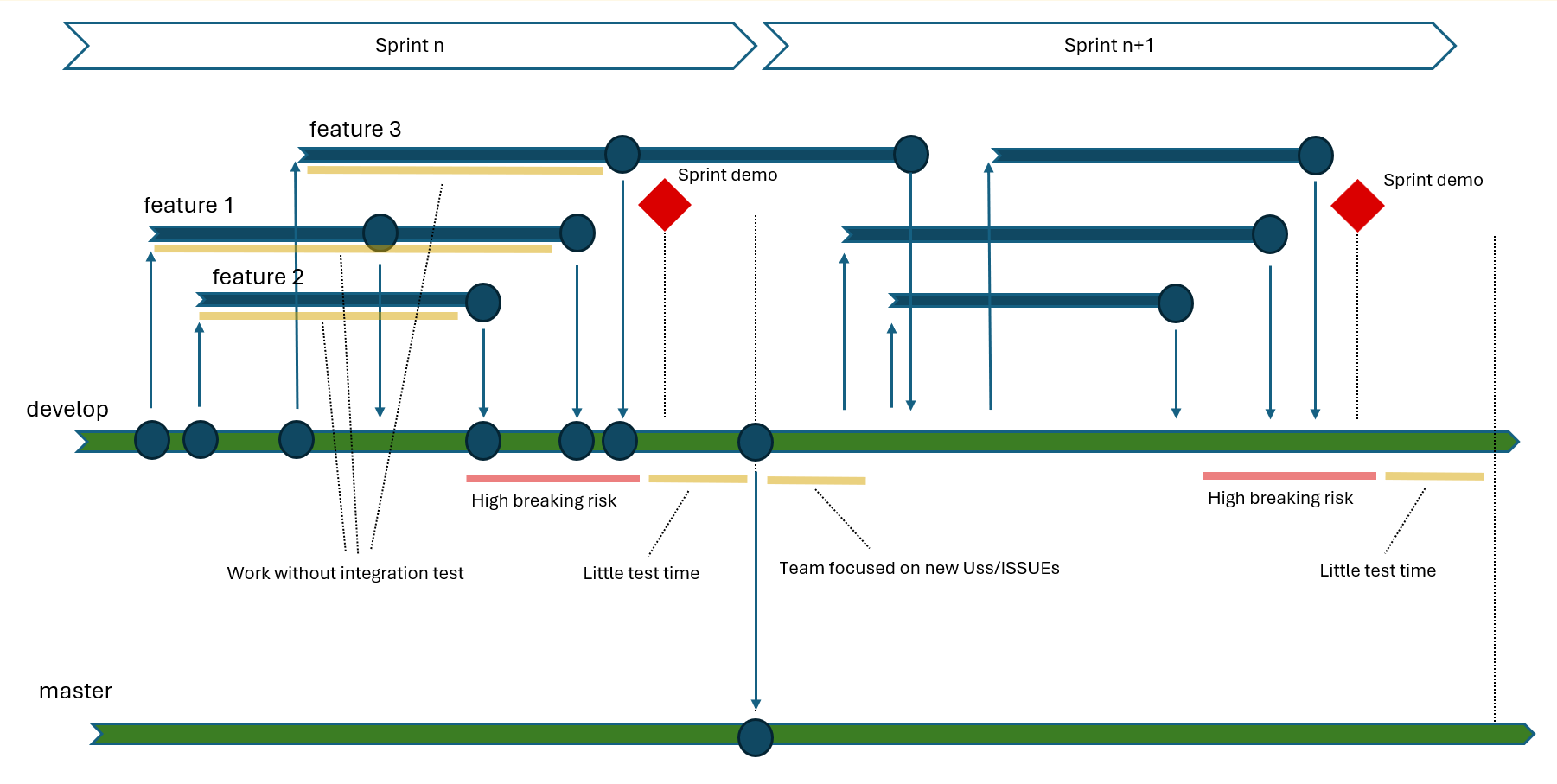 In case partial topics are committed Feature flags should be available to allow branch release in any moment, at least with partial or untested implementations disabled. - In case a breaking change is committed by mistake across the sprint, it should be all team priority detect and solve it.