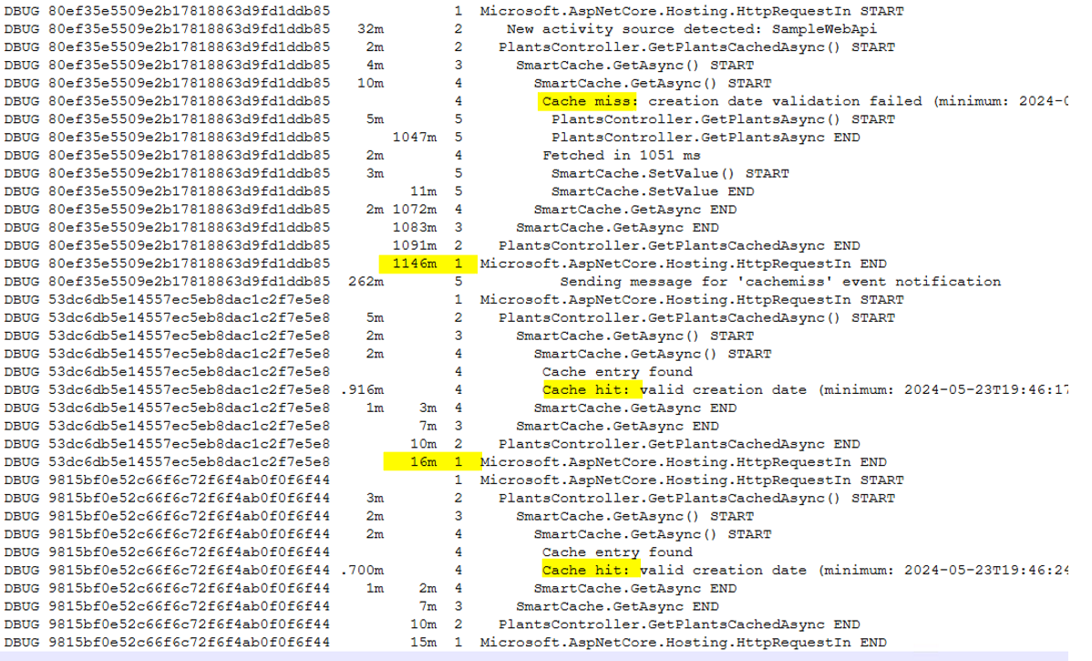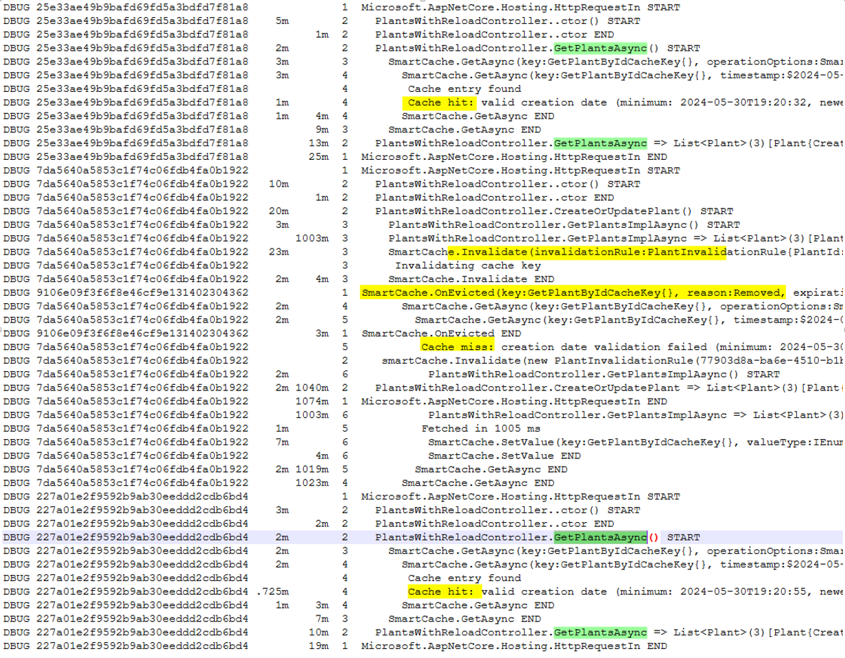 The image below shows that: - after updating a Plant - the GetPlantsAsync call gets a cache miss call as its cache entry has been invalidated