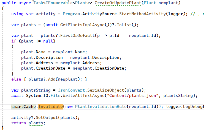 GetPlantByIdAsynccallingGetPlantByIdImplAsyncby means of smartCache servicepublic async Task<Plant> GetPlantByIdAsync([FromRoute] Guid plantId) { using var activity = Program.ActivitySource.StartMethodActivity(logger); var options = new SmartCacheOperationOptions() { MaxAge = TimeSpan.FromMinutes(10) }; var cacheKey = new MethodCallCacheKey(cacheKeyService, typeof(PlantsController), nameof(GetPlantByIdAsync), plantId); var plant = await smartCache.GetAsync(cacheKey, _ => GetPlantByIdImplAsync(plantId), options); activity?.SetOutput(plant); return plant; }the