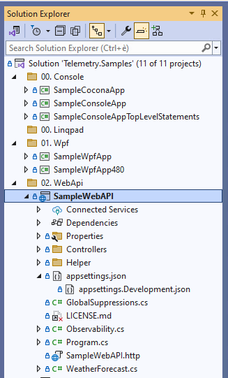 In our samples we enable openteemetry by means of the AddObservability() extension method that essentially: - Configures Opentelemetry options - Registers Opentelemetry logging provider - Configures tracing to the remote tools - Configures metrics to the remote tools