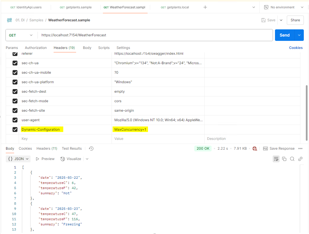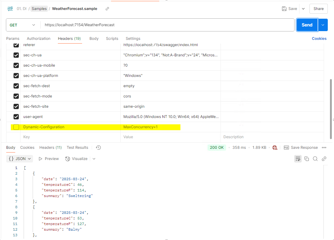 The image below shows a call to the S01_00_SampleWebAPI sample api where MaxConcurrency value is overridden to 1 by means of the Dynamic-Configuration http request header: