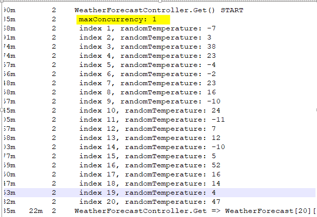 The image below shows a call to the S01_00_SampleWebAPI sample api where MaxConcurrency value 10 is loaded from the appSettings.json: