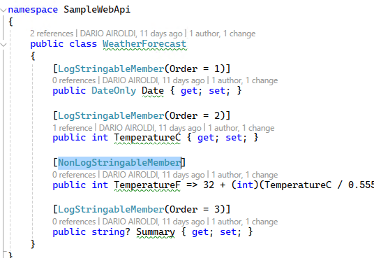 The developer can use attributes LogStringableMember NonLogStringableMember to decide members to be shown with a specific order and members to be excluded from rendering. The image below shows a custom entity where order is defined for members and where non relevant members are excluded by means of the NonLogStringableMember attribute: